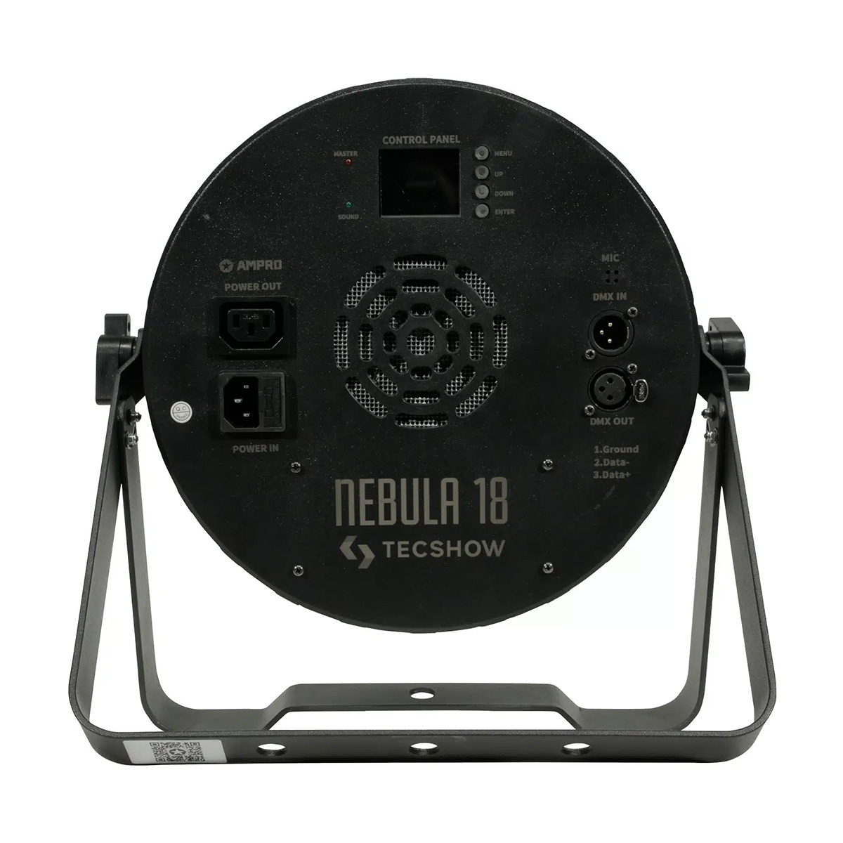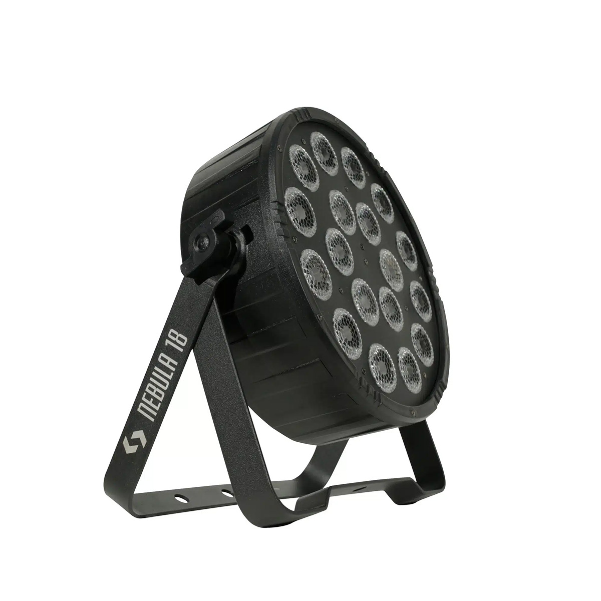 Nebula 18 es un bañador profesional que cuenta con 18 LEDs RGBAW+UV de 12W, con un ángulo de haz de 25º. Su tecnología LED de seis colores permite una mezcla suave sin sombras multicolor, logrando innumerable cantidad de colores profundamente saturados. Nebula 18 tiene dimmer lineal para todos los colores, efecto UV, función estrobo, 33 macros de color y una función de balance de blanco que lo convierte en una opción ideal para aplicaciones de tipo audiovisual. Codigo certificado seguridad eléctrica: MHL-120